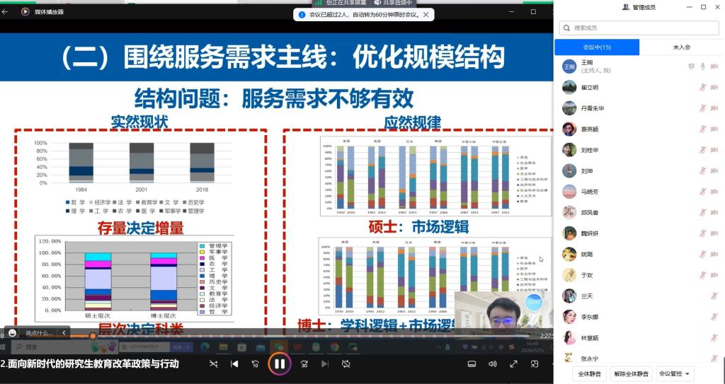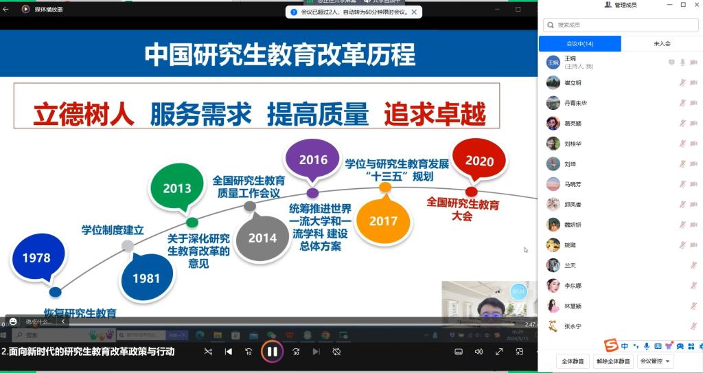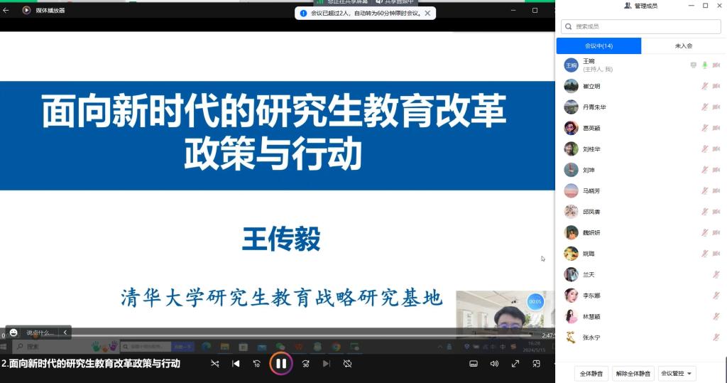要高度重视教育科学研究在教育发展和改革中的重要作用。清华大学副教授王传毅分享专题报告《面向新时代的中国研究生教育改革:近三年研究生教育重大改革政策解读》,解读分析全国研究生教育会议的战略意义,梳理一系列政策文件的逻辑体系。明确了新一轮研究生教育改革的总体目标和根本任务,并分别聚焦全面质量管理、导师队伍建设和专业学位研究生教育,对研究生教育改革作出系统部署。