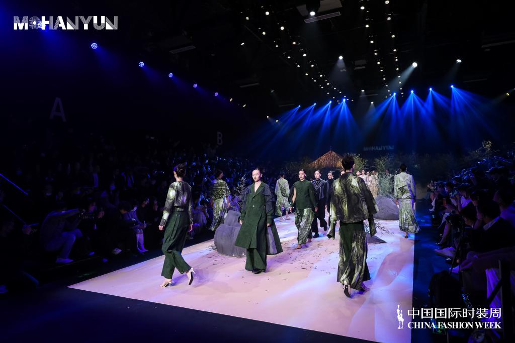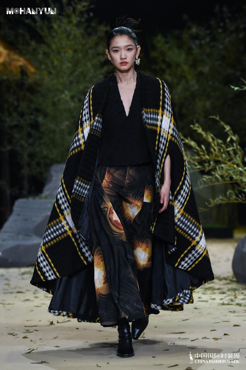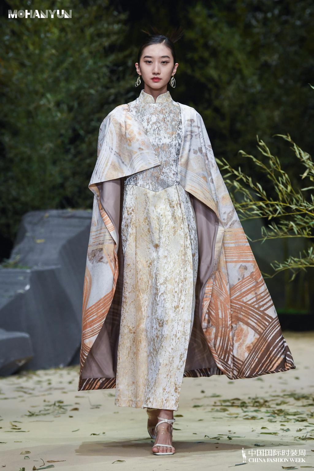 整场发布会以远古自然的笔触,演绎当代年轻人返璞归真的初心。作品延续了MoHanYun品牌一贯低调致雅的风格,着眼于服装肌理脉络矜持的呈现性格,直指当代迷幻青春的痛点。在采用低饱和颜色的同时,加入了一些春绿和乳白,将悸动又自然的心境融合在格纹和石纹中,将青丘山脉迷谷肌理通过“S”型波浪曲线的排列感呈现。用摩登科技与中式典雅的虚实相生,重新解读新生一代理解国潮的入口。