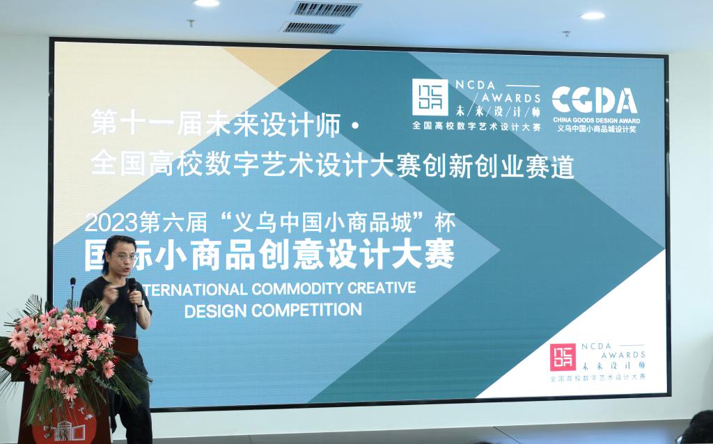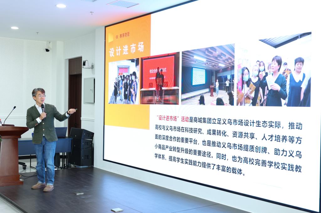 义乌市中国小商品城商会旗下三家公司代表作创新创业赛道推广介绍。义乌中国小商品城创意设计发展服务有限公司副总经理王佐龙对义乌中国小商品城和产教融合小商品设计创新服务体系作了推广介绍;义乌市中国小商品城商会礼品包装行业商会会长单位——义乌米凯伦文化用品有限公司总经理金建华对场景化、个性化包装进行宣传;浙江斍牌创意设计有限公司设计总监喻文力在讲座中分析了当下文具市场趋势,提出主题化、故事化、网络化和风格化的文具文创方向。