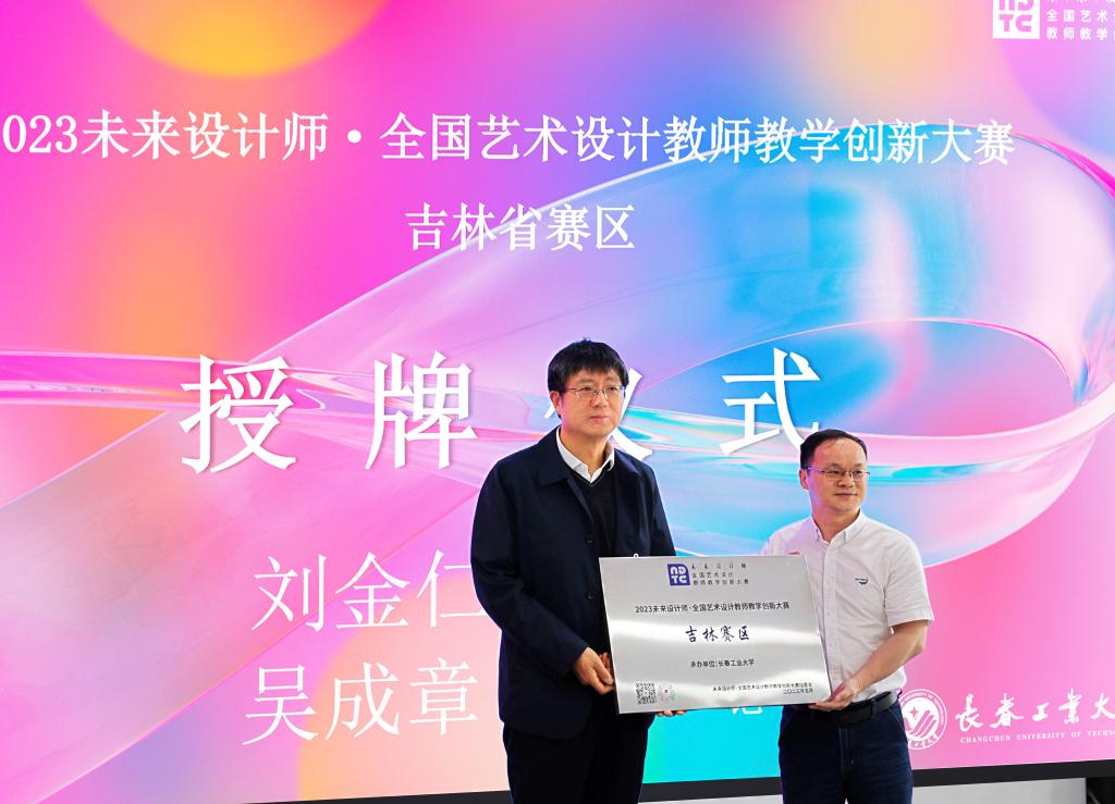 分别颁发“第十一届未来设计师•全国高校数字艺术设计大赛吉林赛区承办单位”授权牌和“2023未来设计师•全国艺术设计教师教学创新大赛吉林赛区承办单位”授权牌,王二辰和吴成章分别代表DB彩票