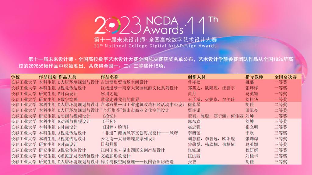 新闻网讯(通讯员 刘桂华)8月25日,第十一届未来设计师•全国高校数字艺术设计大赛(简称NCDA大赛)国赛获奖名单公布,DB彩票