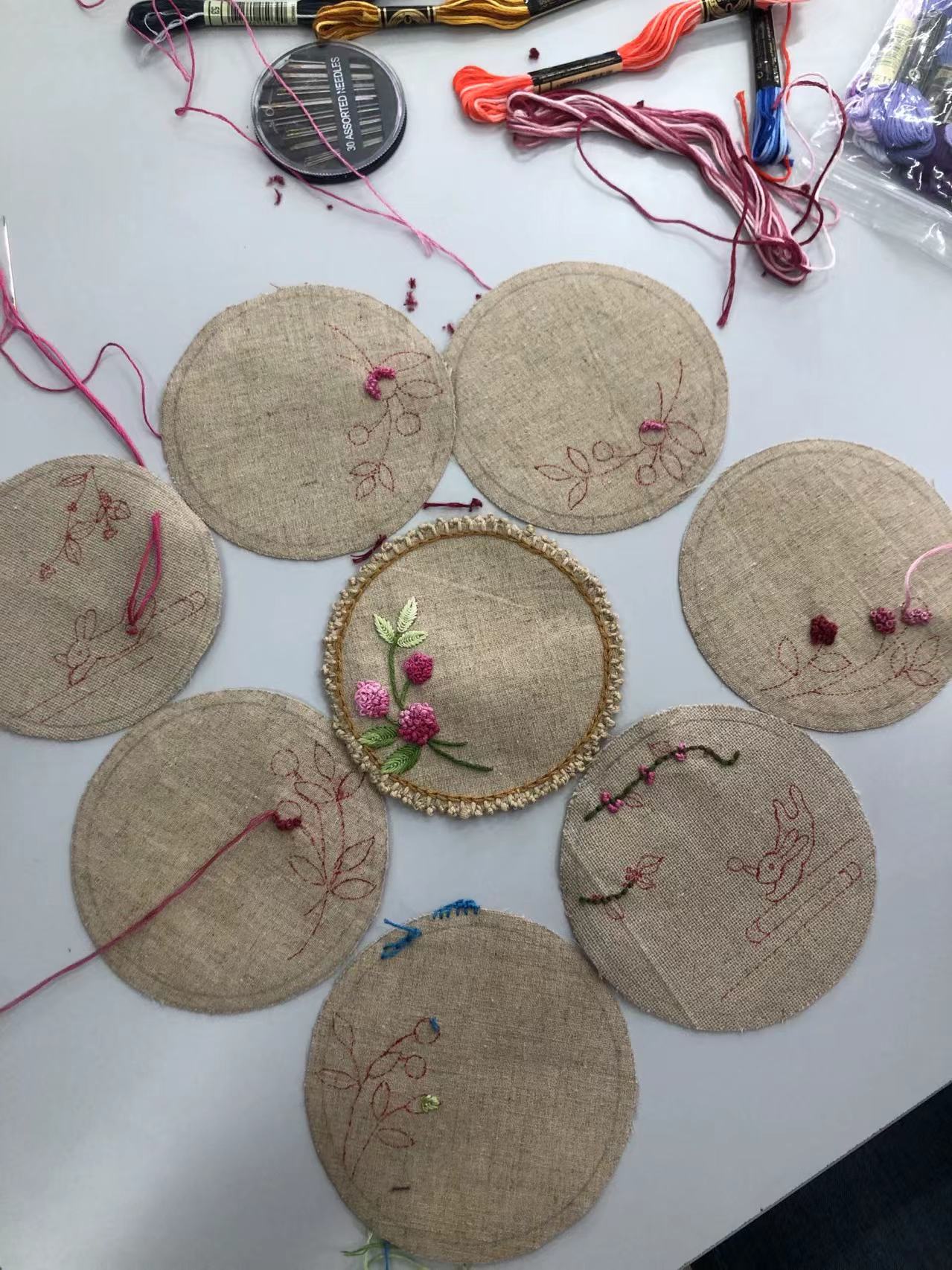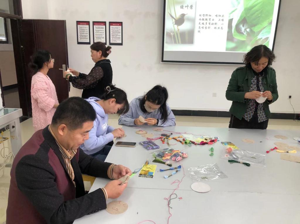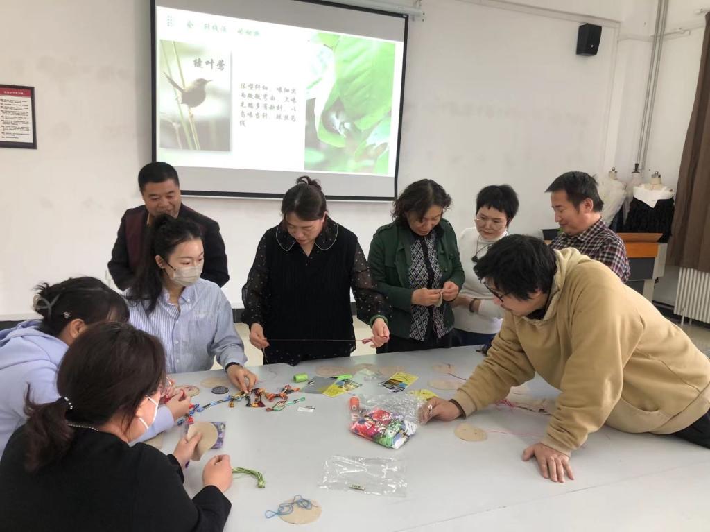 李凤仙详细讲解了手针工艺的基本针法、配色技巧及手针工艺的基本工具与材料,之后又给大家展示了用民族特色针法完成的作品,在欣赏美妙作品的同时,又为大家详细讲解各类针法在实际生活中如何灵活运用,最后参加活动的师生用学到的针法独立缝制一款杯垫。大家纷纷选取了自己喜欢的图案及花色,开始了实际操作。在制作过程中,师生互相帮助互相欣赏,最后在一片欢声笑语中结束活动。