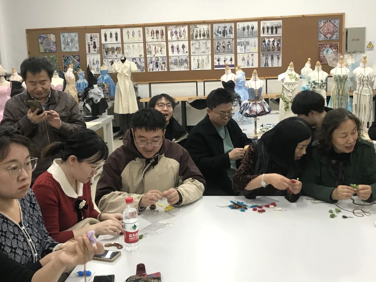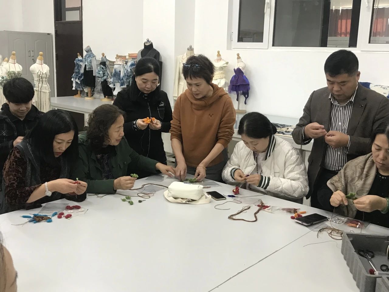 领导和老师们亲自动手,投入到绒花胸针的制作过程,享受着传统艺术带来的乐趣。