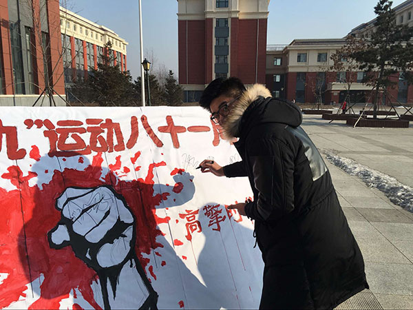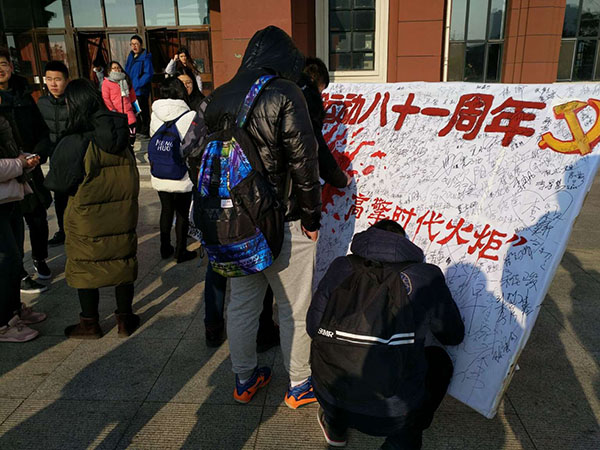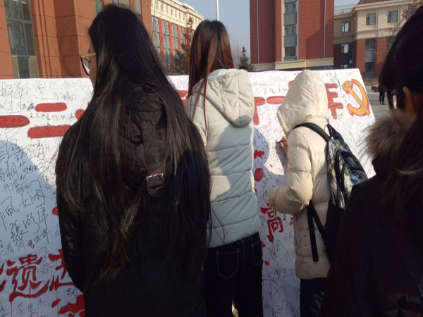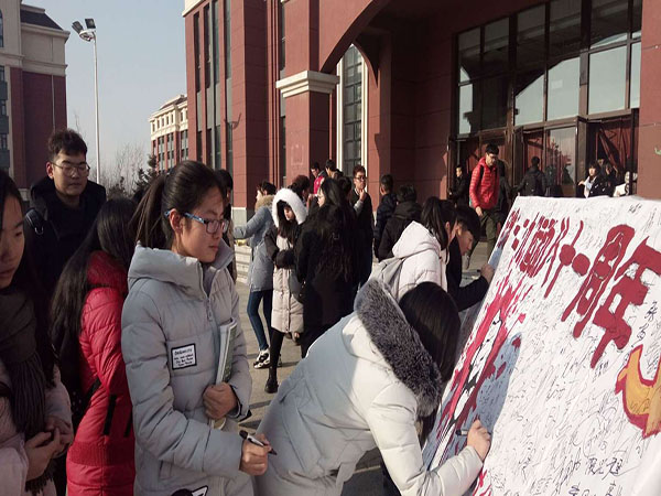 学生会干部的带领下,相关同学将书写着“秉承先辈遗志,高擎时代火炬”的宣传板放置在食堂前,成功的吸引到了来往的师生。顷刻间,展板前围满了人,过往的师生都踊跃签名,来通过此方式传达自己的一份爱国热情。活动持续了两个多小时,活动结束后,展板已经签满了密密麻麻的名字。