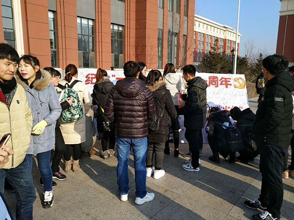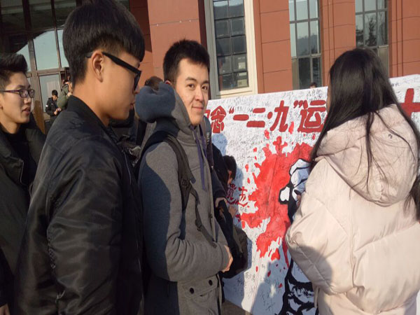 学生会在北湖校区开展了纪念一二九运动八十一周年“秉承先辈遗志,高擎时代火炬”的主题签名活动。主目的是为弘扬以“爱国主义”为 核心的伟大民族精神,唤醒广大青年学子的爱国情怀,增强大学生的光荣感、责任感和使命感表达自己的决心。