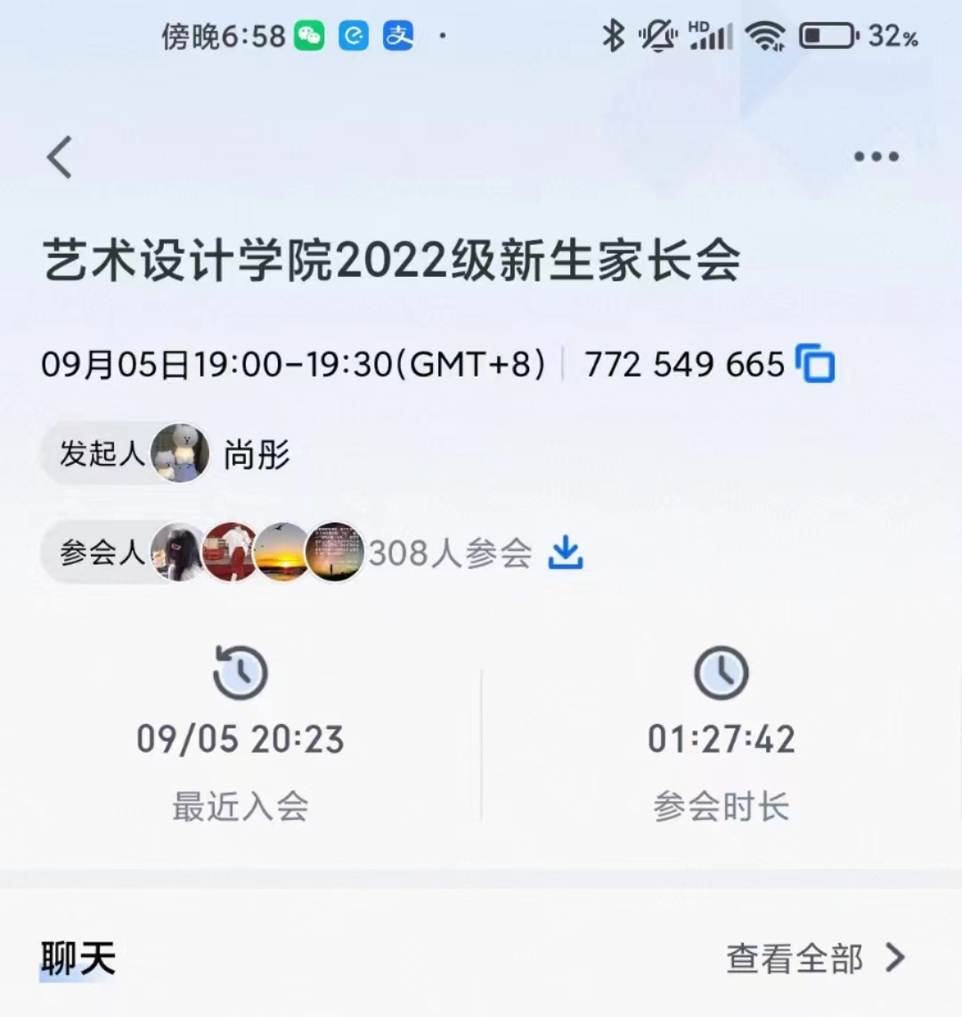 于9月5日19点通过腾讯会议组织召开全体2022级本科新生家长会,会议由辅导员尚彤主持。