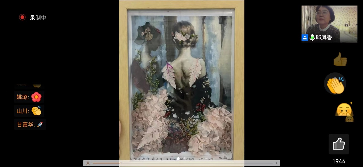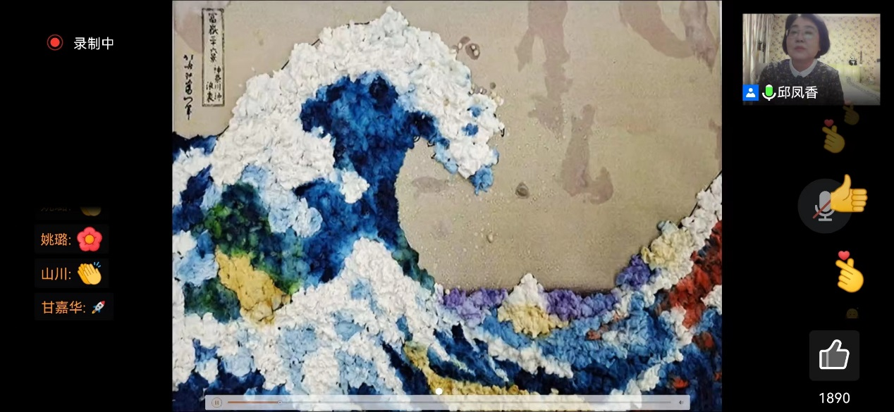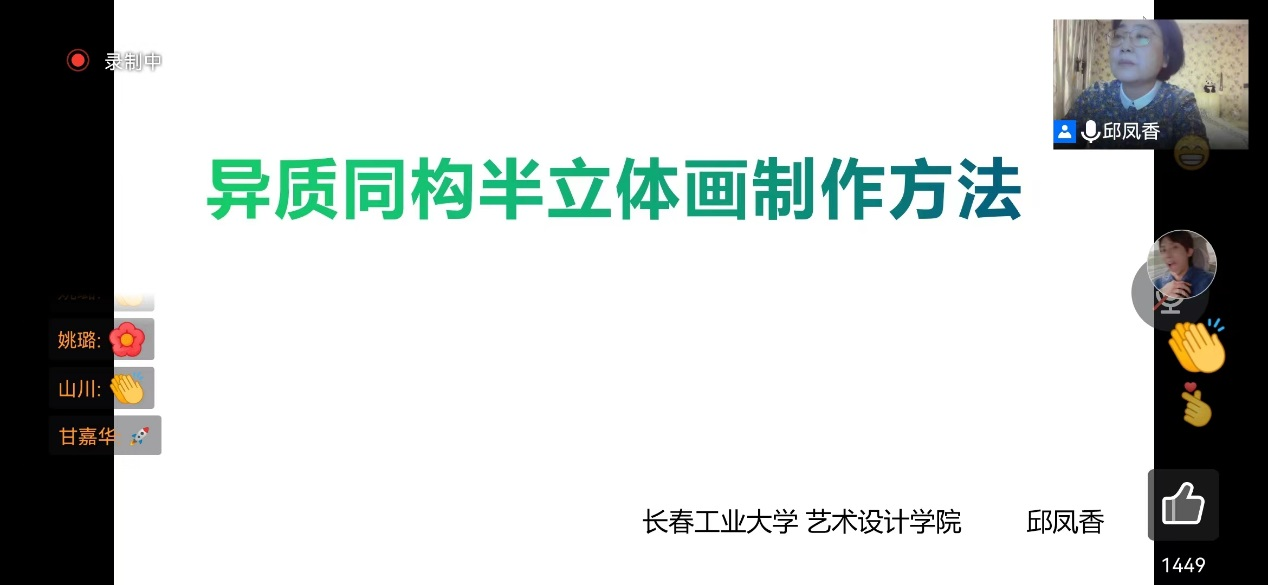 邱凤香老师主讲。邱凤香老师以异质同构半立体画作品云展览开篇,介绍了异质同构的原理以及画面处理中需要注意的色调、突出主体形象等问题。最后以视频演示的形式完成了一幅精品画作。