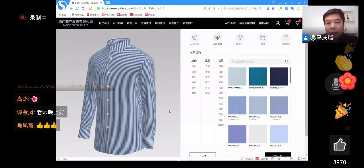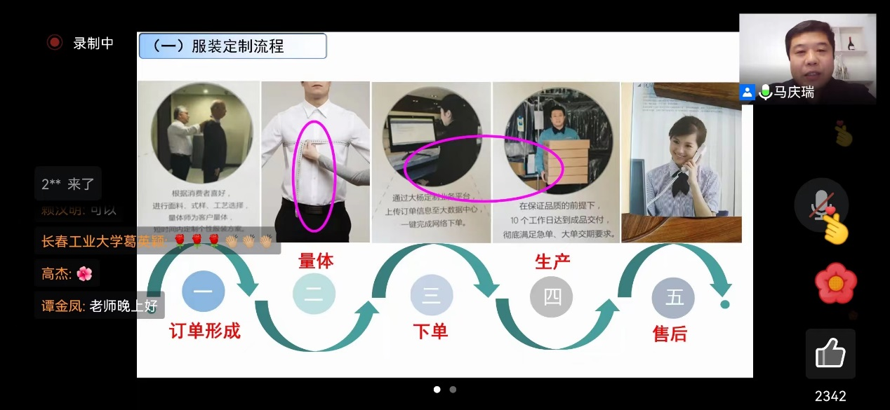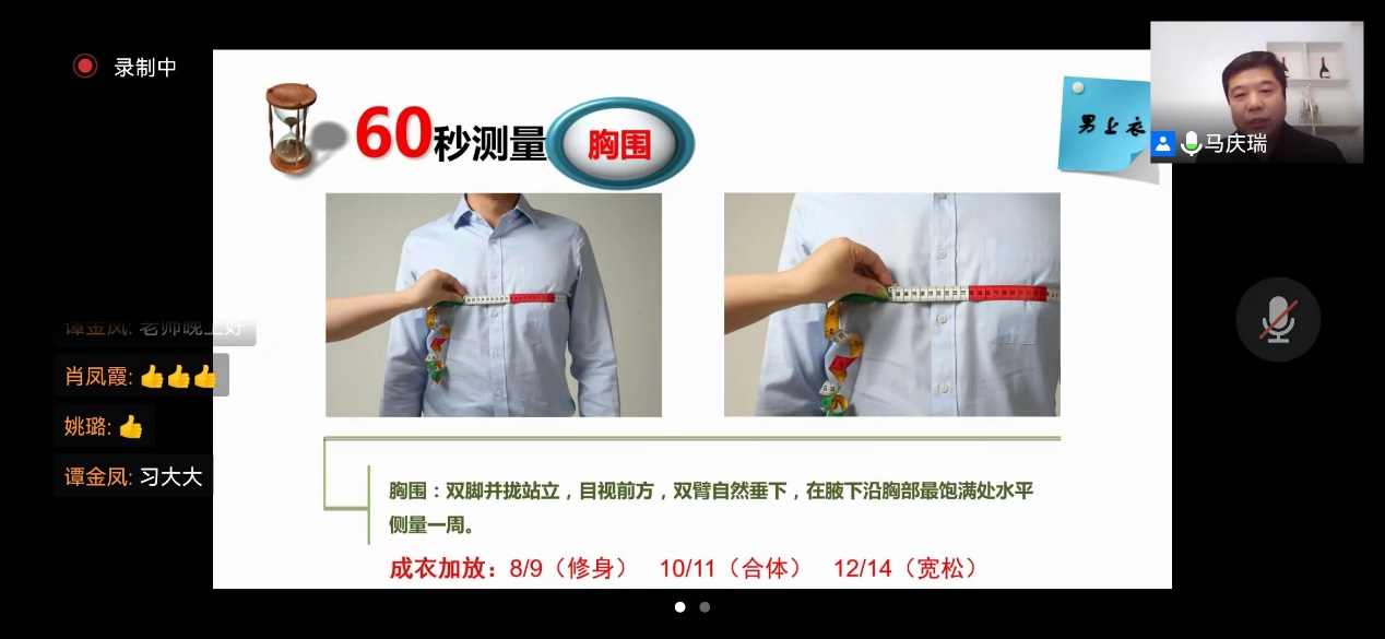 马庆瑞老师主讲。马庆瑞老师解读了高级服装定制的流程,并亲自操作在成衣定制网站怎样定制成衣。以短片视频形式演示测量身体各部位时需要注意的问题,同学们普遍反映通过马老师的讲授避免了自己上网选购成衣会出现的误区。