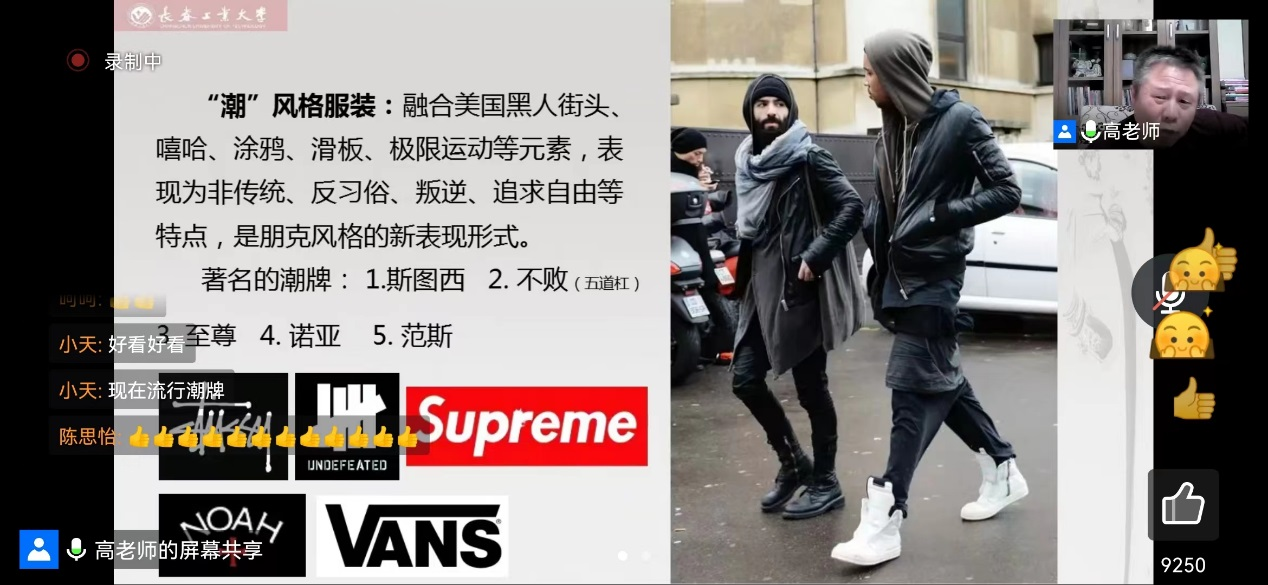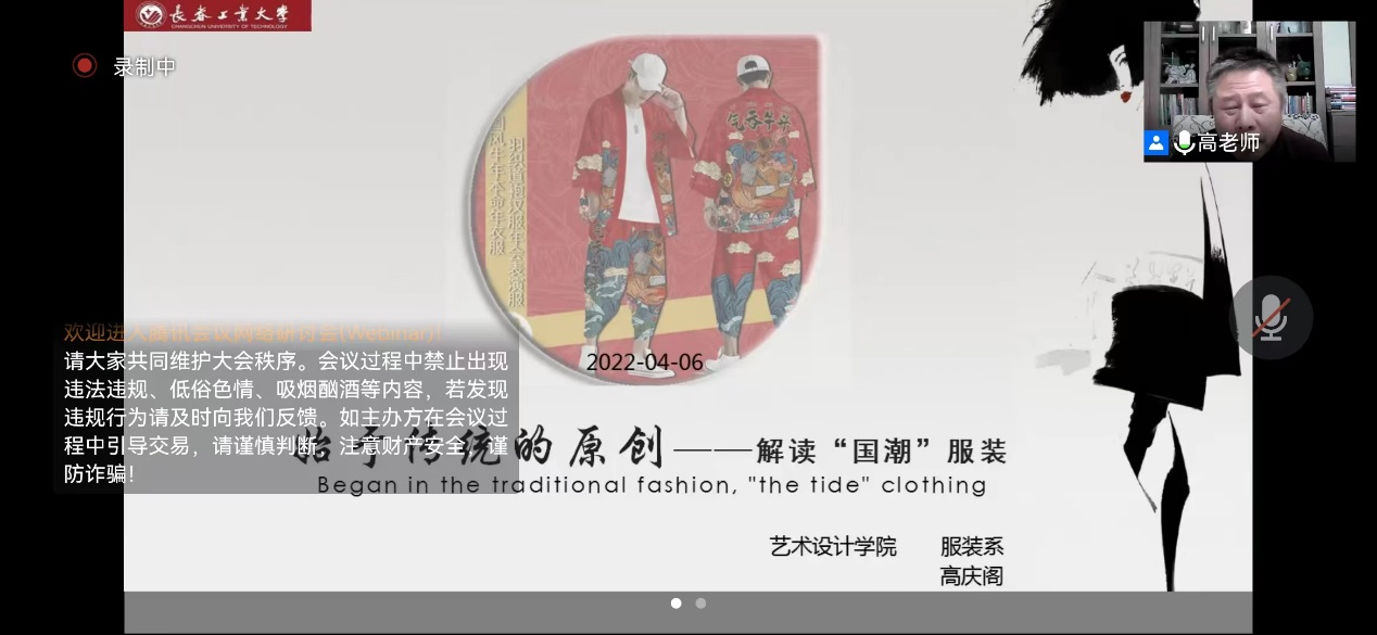 教师高庆阁老师主讲。云端200余人共同观看讲座,高庆阁老师从“国潮”的定义、缘起、发展入手,通过品牌发布会和成衣风格进一步解读 “国潮”在当今世界时尚圈发挥的重要作品。讲座现场热烈,受到广大师生的好评。