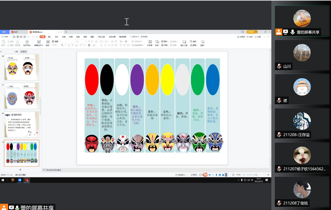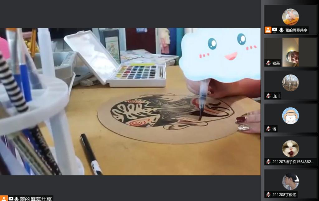 教师张蕾蕾老师主讲。云端300余人共同观看讲座,张蕾蕾老师从认识中华民族的瑰宝——京剧脸谱入手,亲自示范绘制京剧脸谱,指导同学们利用业余时间以京剧脸谱为范本制作装饰画和书签作品,疫情期间丰富自己的业余文化生活。